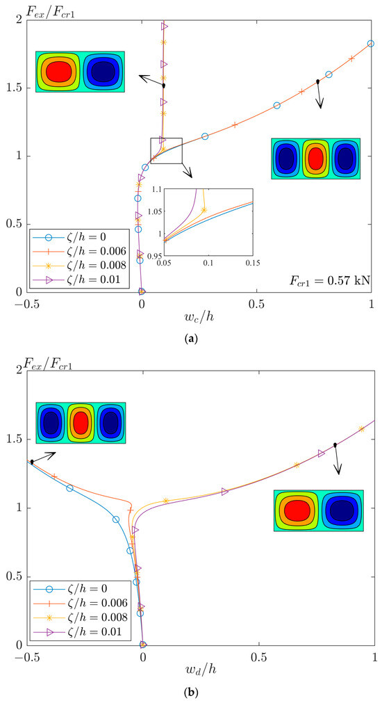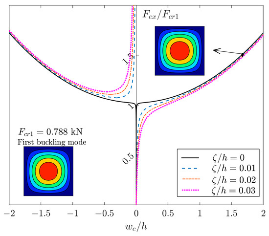 In this regard, the post-buckling curves of the perfect and imperfect plate are plotted in Figure 7a. In this figure, a plate with and different amplitudes of imperfection of the first buckling mode is analyzed. As seen, the second bifurcation point, tertiary equilibrium path, or jumping mode (based on different terminology in the literature) can occur by applying an amplitude of imperfection larger than 0.006. Also, the moment of separation of different curves is magnified in this figure. The differences between the equilibrium paths of a plate with imperfections of 0.006 and 0.008 can be interpreted as confrontation of two quantities. Both parameters (extension–bending coupling and imperfection) force the plate to have a different mode. When the plate has higher imperfection, it overcomes the extension–bending coupling and the mode shape of plate is the same as the mode shape of imperfection. However, a plate with a lower value of imperfection has a mode shape based on a condition that the extension–bending coupling forces on the plate (see Figure 3d).