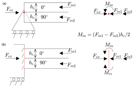 The schematics of reaction forces in a two-layer plate [0/90] with different kinds of boundary conditions and their free body diagrams: (a) movable simply support; (b) movable clamped.