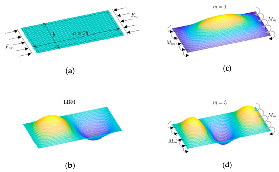 (a) A rectangular plate () under compression, (b) linear buckling mode (LBM), and (c), (d) possible deflections in nonlinear post-buckling analysis (either or ).