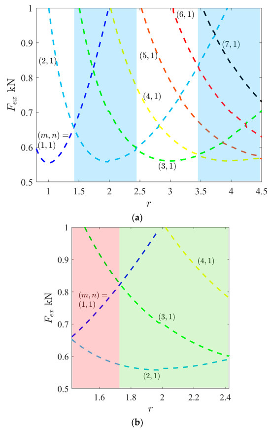 Usually, the result of buckling mode based on a linear analysis (eigenvalue problem) is the same as the result in the geometrically nonlinear analysis. Therefore, a very small amplitude of this linear mode can be employed as an imperfection to be sure that the plate tends to this mode in a nonlinear analysis. However, one exceptional phenomenon can occur in the unsymmetric and non-square laminated composites. This means that there are possibilities to see different modes of deflection based on linear buckling and nonlinear post-buckling analysis (even with the presence of imperfection of linear buckling mode). The reason for this is illustrated in Figure 3. For instance, it is obvious that a GFRP plate with a lay-up arrangement of [(0/90)4] and aspect ratio (i.e., length/width) has a linear buckling mode (or LBM) as . In other words, two waves and one half-wave will appear in the loading and perpendicular in-plane directions of the plate, respectively. As seen, due to the existence of edge moments on both of the opposite sides of the plate (see Section 2), the results of the nonlinear analysis indicate that the mode can be either (1,1) or (3,1). Because the directions of these moments do not lead to observing an even number of half-waves, the selection of actual mode (between or 3) lies in the value of the second buckling load. Therefore, the variations in the buckling loads versus the aspect ratio are plotted in Figure 4a. As seen, blue areas correspond to an even number of half-waves in critical buckling mode (e.g., ). This means that these areas are for those non-square plates which are prone to having different modes based on linear and nonlinear analyses. For example, in the first blue area, the critical buckling load (in a range ) corresponds to the mode with two half-waves (in LBM). In this range, the second buckling load plays a vital role. By considering this quantity, the blue area can be divided into two other sub-areas (Figure 4b). First, there is a range as , where the second buckling mode is and there is another range as for . Therefore, the deflections of the plates based on the geometrically nonlinear analysis of the red sub-area are like , and those of the green sub-area are like , according to Figure 4b. It should be noted that these modes are for a very initial post-buckling range. Then, a question arises: what is the deflection when it is slightly far away (i.e., not very initially)? By conducting many nonlinear studies in ANSYS software, the evidence proved that for a plate with an aspect ratio in the first sub-area (for this case, ), the possibility of the occurrence of a tertiary equilibrium path is almost zero. This means that the plate keeps the mode and then will be a mixed of and in a very far post-buckling range [24]. However, the second sub-area is unstable, and the occurrence of a tertiary equilibrium path is possible, which is described in the next section.