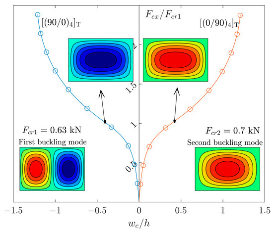 Figure 5 demonstrates the equilibrium paths of the GFRP plates () with lay-up arrangements of [(0/90)4]T and [(90/0)4]T. According to Figure 3b, it is obvious that the linear and nonlinear modes of such an aspect ratio are and , respectively. In Figure 5, there is not any imperfection. In this case, the solution has no two curve parts (see Figure 1) due to the presence of extension–bending coupling. The right curve is the result of [(0/90)4]T, and the left curve is the result of [(90/0)4]T. This order of layer arrangement from the bottom to the top is highly effective on the direction of moment (see Figure 2). However, both curves correspond to the same mode of deflection. In addition, a small value of imperfection of the first buckling mode will not affect the curves.