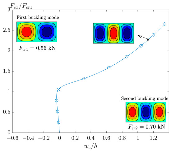 Now it is time to select a plate with an aspect ratio higher than 1.72 (see green area in Figure 4b). The post-buckling response of the GFRP plate with is demonstrated in Figure 6. In this figure, there is no imperfection and, as mentioned previously, the linear buckling mode is and the deflection in post-buckling has a shape like . However, this post-buckling curve is unstable, and by adding a small value of imperfection of the first buckling mode, the results will be different.