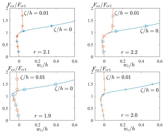 Figure 8 presents the different aspect ratios (e.g., and ) to illustrate the time of mode jumping. In other words, the time of mode jumping means the location of the point where the red path separates from the blue path. As seen, the location of this point is delayed by increasing the value of the aspect ratio. The physical meaning of this delay comes from Figure 4b. According to the green sub-area of Figure 4b, by increasing the aspect ratio from to , the second buckling load (with the same mode in blue path) is decreased, and it comes closer to the first buckling load (with the same mode in red path). This means that the second buckling mode is becoming stable, and the time of mode jumping from the second to first buckling mode will be postponed.