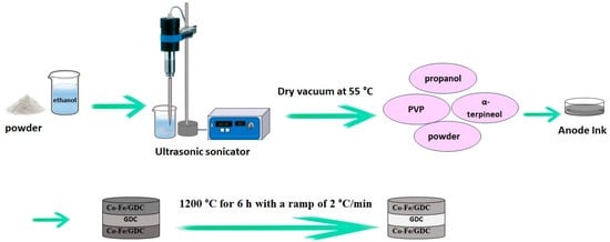 Suspension inks of S2 and S5 samples with an equal volume ratio of Co-Fe/GDC (50:50 vol.%) (S2) and Co-Fe/GDC (60:40 vol.%) (S5) were prepared for electrochemical studies. To achieve the required porosity for the anode involved dispersing specific amounts of ceramic powder in ethanol and subjecting it to ultrasonication using a FB-705 sonicator (Fisher Scientific, Waltham, MA, USA) at 40 amps with 5 s pulses for a total active time of 30 min, followed by the addition of pore formers (1.0 wt.% nano-sized carbon and 5.0 wt.% macro-sized carbon) and sonication for further 5.0 min. Afterward, the resulting mixture was dried under a vacuum at 55 °C. The powders obtained were crushed in an agate mortar and subsequently utilised to create ink. The powders were evenly dispersed in a combination of propanol and α-terpineol solvents (in a 50:50 ratio by volume), with the inclusion of 3% PVP as a polymer-based dispersing agent. Anode and electrolyte pellets were prepared using an MTI Corporation YLJ-24T desk-top (MTI Corporation, Richmond, VA, USA) manual pressing machine, exerting a force of 5.0 MPa for 30 s, followed by an increase to 10 MPa for an additional 90 s. The GDC pellets were pre-sintered in a furnace, in the air at 950 °C for 4.0 h, with a slow ramp of 1.5 °C/min to prevent thermal stress and avoid breaking the disks. The anode ink was deposited on both sides of GDC using screen printing to achieve the desired thickness for the symmetrical cell. The fabricated cell was then co-sintered at 1200 °C for 6.0 h at a rate of 2 °C/min. The process of fabricating symmetric cells is represented in Figure 2, showcasing the various steps.