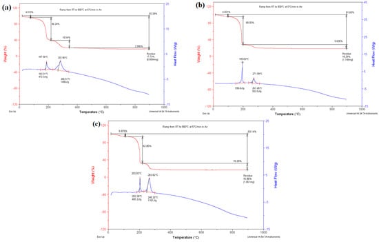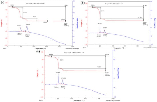 DCS-TGA profiles of the thermal decomposition of the prepared samples, including (a) S1, (b) S2, and (c) S3 before calcination.