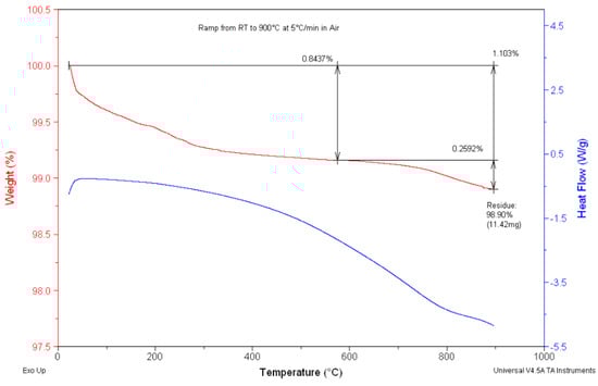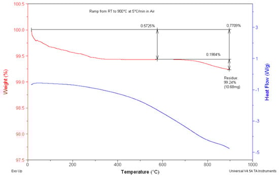 To examine the existence of carbon in the samples employed for the fabrication of the cells, a DSC-TGA analysis was performed after the calcination process at 700 °C (Figure 4). According to the EDX data corroborating the TGA findings, only a minimal presence of carbon was left in the sample after 700 °C, affirming that 700 °C was the optimum calcination temperature. Chen et al. [32] emphasised the significance of accurate baseline calibration, as discrepancies stemming from varying experimental parameters or thermal masses can result in non-linear baselines. The curly baseline observed in the DSC curves can be attributed to changes in the sample’s heat capacity during thermal processes.