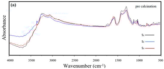An FT-IR analysis was performed on samples S1, S2, and S3 both before and after calcination at different temperatures to confirm the characterisation of ceramic materials used for fabricating the symmetrical cell (Figure 7). Before calcination (Figure 7a), the presence of the O-H bond indicated the existence of water in all samples, and the peak of the corresponding was visible within the range of 3000 cm−1 and 3500 cm−1, expressing the O-H stretching vibration. This observation can be attributed to the fact that when the samples were exposed to the air, they absorbed a small amount of moisture present in the environment [35,36]. It is also possible that a peak corresponding to O-H bond bending may be present at approximately 1650 cm−1 [37]. Moreover, the peaks detected within the range of 1000 cm−1 to 1800 cm−1 are likely due to the presence of C-H bonds, as well as both COO- and –COO bonds found in the tartrate structure, and those associated with the presence of ammonium nitrate in the by-product [38]. The synthesis of the powders took place at room temperature, and it can be inferred that the reaction between tartrate and metal nitrates resulted in the formation of ammonium IV nitrate, which exhibited an orthorhombic crystalline structure [39]. Compared to other phases, ammonium IV nitrate showed broad peaks spanning from 1200 cm−1 to 1600 cm−1. Such intensity peaks can be observed in Figure 5a for samples prior to calcination [40].