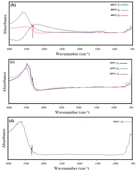 FT-IR Spectra for (a) pre-calcination, (b) calcination sample S1, S2, and S3 at 400 °C, (c) calcination sample S1, S2, and S3 at 600 °C, (d) S2 post-calcination at 700 °C.