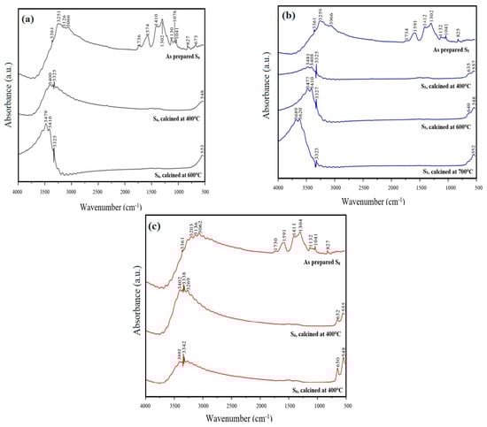 FT-IR spectra of (a,c) S4 and S6 pre- and post-calcination at 400 °C and 600 °C, (b) S5 pre- and post-calcination at 400 °C, 600 °C, and 700 °C.