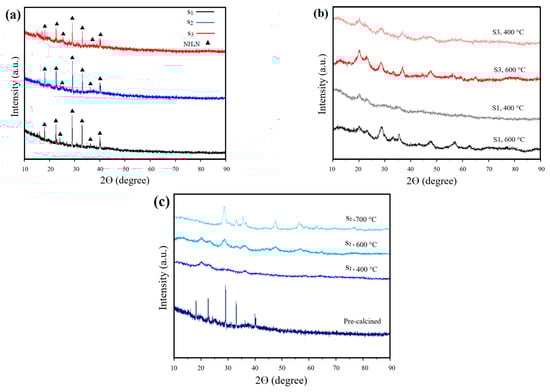 XRD patterns of (a) samples before calcination, (b) sample S1 and S3 after calcination at 400 °C and 600 °C, (c) S2 calcined at different temperatures of 400, 600, and 700 °C.