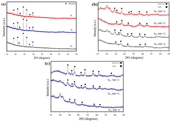 Figure 10a shows the XRD patterns for as-prepared samples S4, S5, and S6, showing distinct peaks corresponding to ammonium nitrate. The Miller indices and corresponding angles for these peaks are shown in Table 3. The prevalence of peaks for ammonium nitrate was expected in these samples due to the large amount present prior to calcination. Figure 10b,c show the XRD patterns for samples after calcination at different temperatures. The samples calcined at 400 °C did not show clear or distinct peaks and display a significant amount of noise, indicating the presence of amorphous carbon in the samples [44]. The peaks corresponded to FeO, COO, CeO2, and Gd203, with Miller indices and corresponding angles shown in Table 4. Due to the proximity of the XRD peaks for FeO and Coo, and CeO2 and Gd2O3, they were grouped as Co-Fe and GDC on the XRD patterns.