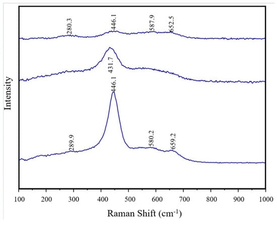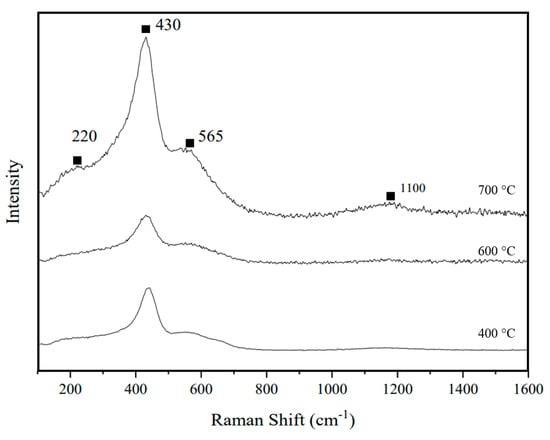 After undergoing calcination at 400 °C (Figure 7b), 600 °C (Figure 7c), and 700 °C (Figure 7d), the FT-IR analysis was used to verify the removal of ammonium nitrate and the conversion of metal tartrates to metal oxides during decomposition and oxidation processes. As shown in Figure 5b, the peaks within the range of approximately 1000 cm−1 to 2000 cm−1 exhibited a reduced intensity, indicating that the calcination temperatures, even at 400 °C, were adequate for a complete reaction. The FT-IR spectra of all three samples demonstrated comparable peaks before and after calcination, indicating a consistent approach for powder synthesis and calcination, supported by the TGA results. The appearance of minor peaks within the range of 2300 cm−1 to 2400 cm−1 could be attributed to the presence of CO2 gas, which was likely formed through interactions with the surrounding environment. Notably, these peaks were consistently observed in the FT-IR spectra both after and before calcination. The introduction of this CO2 could have occurred through something as simple as breathing on the equipment, thereby making its removal a considerably challenging task [41]. The sample contained metal–oxygen bonds, indicated by the peaks at 900 cm−1 and 525 cm−1. Nevertheless, identifying each metal oxide within the spectra proves difficult. The presence of gadolinium oxides, cerium, cobalt, cerium, and iron was confirmed by subjecting S2 to calcination at 700 °C and subsequently conducting Raman spectroscopy.