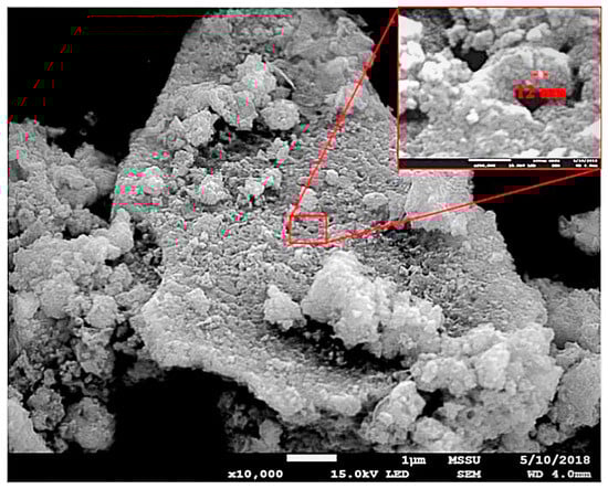Figure 14 shows the SEM image of S5 calcined at 700 °C, revealing a particle size of 11 nm. This aligned with the mean crystalline size calculated from the XRD results, as shown in Table 7, confirming that the material synthesis resulted in the production of a nanopowder.