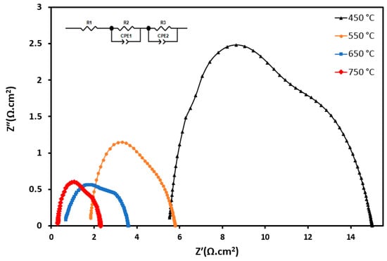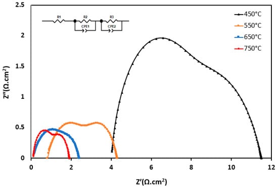 Figure 15 displays the Nyquist plot of the impedance spectra for the symmetric anode cells that were evaluated at temperatures from 450 °C to 650 °C in air. The arc’s size reflects the extent of the polarisation losses, and the Nyquist plots were additionally examined utilising the equivalent circuit model shown in Figure 15. However, as the spectra suggest, two major processes can be identified at different temperatures; the spectra recorded at 450 °C slightly show three semicircles. The high-frequency arc seems to be overlapped and disappear as the temperature increases. These semicircles may be ascribed to the presence of grain boundaries, grain impedance, and the interfaces between the electrolyte and the electrode (current collector). In this work, the equivalent circuit fit was obtained by implementing a model with two constant phase elements, each in parallel with a resistor, as inserted in Figure 15. At higher frequencies, the ohmic resistance can be identified by examining the point where the impedance semicircle intersects the (Z′) in the Nyquist plot, as shown in Table 8.