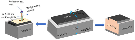 Figure 2 shows the preparation of the test samples. At the end of the experiment, each sample was cooled to room temperature (−20 °C) in air. Sample block 1# and sample block 2# were cut from the substrate using the EDM technique and used for mechanical property testing and microstructure observation of the composite coatings, respectively. Planes 1 and 2 were polished with SiC sandpaper with grit sizes ranging from 400 mesh to 3000 mesh. Subsequently, the planes were polished to a mirror-like surface with diamond polishing paste with a grit size of 2 μm, and then washed and blown dry. Plane 2 was sanded and polished and then placed in HF acid etching solution (HF:HNO3:H2O = 1:1:10) for 10–15 s. Before testing, all sample blocks were placed in alcohol and ultrasonically cleaned for 2 min to remove surface dirt, and finally, the samples were blown dry with an air blower.