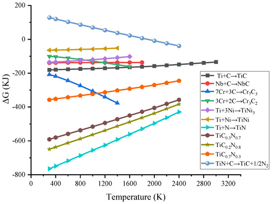 where denotes the entropy of substance i at the temperature of 298 K, and denotes the latent heat due to the phase transition of substance i. Since the crystal structures of TiC and TiN are very similar, it is very easy to form a Ti(C, N) solid solution, and its Gibbs free energy can be calculated by the following equation [30]: