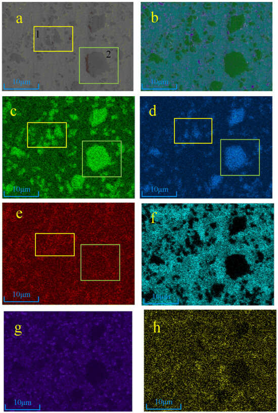The EDS results and the distribution of Ti, N, C, Ni, and Cr elements in sample 4 are shown in Figure 6. It can be seen that due to the high addition of TiN, Ti, and graphite in the powder, the distribution of Ti and N elements overlap well. It can be judged that the black dots and lumps in the electron diagram are TiN particles, region 1 (box 1 in Figure 6) is small TiN particles, and region 2 (box 2 in Figure 6) is large TiN particles. Element C is densely distributed around the small black lumps and large black masses. From Figure 6c–e, it can be seen that the three elements of Ti, N, and C are enriched in region 1. Combined with the previous XRD and thermodynamic analyses, it can be judged to be a Ti(C, N) solid solution formed with C elements after the melting of small-grained TiN. C is present at the periphery of the large particles of TiN in region 2, while a small area in the lower right corner is observed to contain Ti, C, and N. Combined with the XRD results, it can be determined to be a Ti (C, N) phase, and it is more obvious than that of sample 3#.