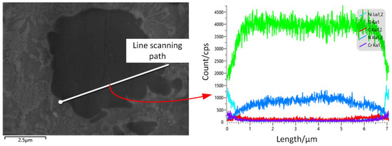 To further investigate the substitution reaction of the C element and N element around TiN particles, the line scan of TiN with large particles in sample 4# was carried out individually. As shown in Figure 7, the content of elemental C increases while the content of elemental N decreases around the large particles of TiN. It can be found that the disappearance of elemental N and the appearance of elemental C occur at the edges of the large particles of TiN. A narrow gray band is found around the TiN in the figure, which can be ascribed to the newly formed TiC-enhanced phase, and all these validate the substitution reaction between the N atoms and the C atoms.