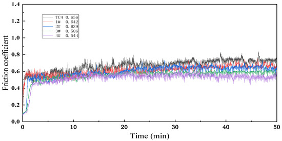 The friction coefficient and worn surface of each sample are shown in Figure 8 and Figure 9. Tribological properties are one of the important macroscopic characteristics for evaluating the mechanical properties of laser cladding layers. In this study, the wear properties of the laser cladding layers of each sample were tested to evaluate the wear resistance of Ti(C, N)-reinforced composites using the friction coefficient, wear volume, and wear surface morphology as the main performance indexes. To visualize the tribological properties of each sample, the matrix and samples were tested under the same conditions. The friction coefficient curves of different samples 1#–4# are shown in Figure 8. It can be seen that the wear process of each sample went through two wear stages: the pre-stable run-in stage and the stabilization stage (around 20 min). The data of 20 min–50 min are chosen here to calculate the average friction coefficient of each sample. The average values of 0.656, 0.642, 0.639, 0.586, and 0.544 for the substrate and samples #1–4 are in the following order of magnitude: TC4 substrate: > 1# > 2# > 3# > 4#. The coefficient of friction of sample 4# is the smallest, 0.829 times that of the substrate.