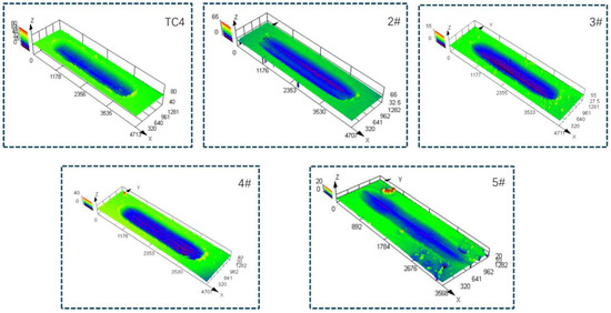 Optical surface morphology of abrasion marks on TC4 substrate and specimens 1#–4#.