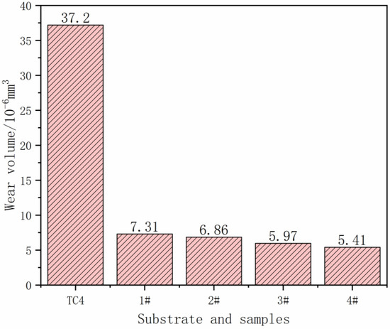 The worn surface profiles of each sample are shown in Figure 9. Based on the cross-sectional area of the wear morphology and the wear distance, the wear volume of the matrix and each sample can be calculated, and the results are shown in Figure 10. It can be seen that with the increase in the powder addition ratio, the wear volume of the coating shows a decreasing trend. The wear resistance of the surface coating is improved. The wear volume of sample 4# is the smallest, which is 0.145 times the wear volume of the substrate. The reason is that with the increase in TiN, Ti, and graphite added in the powder, the ceramic phase in the fusion cladding layer, TiC, Ti (C, N), and Ti2Ni, and other hard phases play the structural role of the “skeleton”, inhibiting the damage brought about by the micro-cutting to impede the movement of the tearing point of the incision so that the coating has higher abrasion resistance.