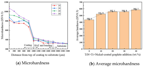 - With the increase in TiN + Ti + Ni-encapsulated graphite addition, the average microhardness of the coatings increased from 436.5 to 583.7 HV0.3, and the average microhardness of coatings of specimens 1#–4# was 1.62, 1.71, 1.81, and 1.92 times higher than that of the set plate, respectively. The average microhardness of the coatings is proportional to the content of the initial powder, TiN + Ti + C. The reasons for this were analyzed to be the in situ synthesis of Ti (C, N) ceramic particles and multiple ceramic phases and the increase in hard phases, such as TiNi and CrXCY, which enhanced the coating’s ability to resist deformation.