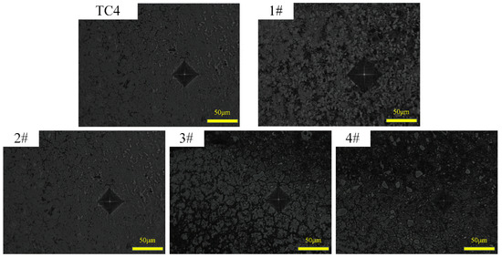 Figure 12 shows the typical indentation morphology on the cross-section of the substrate and specimens 1#–4# coatings. It can be noticed that the indentation is regular and there are no microscopic cracks around it, which indicates that the composite coating has a high hardness while still maintaining good toughness.