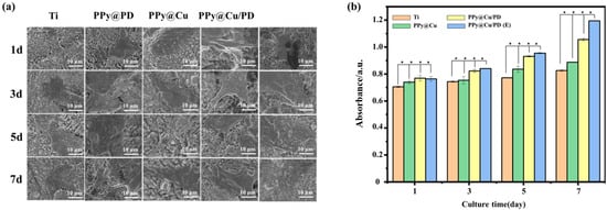 Osteoblasts are fundamental units in bone formation, so it is necessary to investigate the compatibility of the PPy@Cu/PD coating with osteoblasts. When the cells were cultured on the PPy@Cu/PD coating surface, the osteoblasts began to adhere on day 1, pseudopodia protruded from cell edges on day 3, and then spread well and sufficiently on day 5. The cells were connected and completed stretched out on the PPy@Cu/PD coating surface on day 7 (Figure 5a).