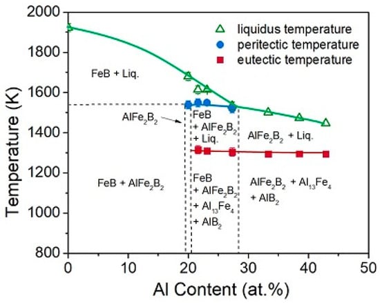 Formation of secondary phases (FeB, AlB2, and Al13Fe4) cannot be avoided when the alloy solidifies through this two-phase region [2,5,6,7,8,9,10,11,12,13,14,15,16,17,18], which extends over 200 °C at the cooling rates available during standard melt-based processing, and typically, the alloy is annealed below the peritectic temperature to improve its phase purity further. Since Al has a low melting point of ~660 °C, excess Al (~20–50 mol% above stoichiometry) is often added to compensate for its evaporation. While excess Al can inhibit the formation of the FeB phase, it leads to Al-rich secondary impurities (namely Al13Fe4), which are subsequently removed via etching in dilute acid solutions [11].
