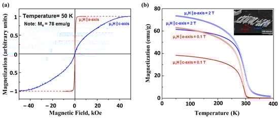 (a) Field-dependent magnetization curves of a single Fe2AlB2 crystallite at 50K. For all magnetic measurements, the external magnetic field was applied in the (ac) plane, either along the a- or the c-axis of the orthorhombic crystal structure. (b) Temperature-dependent magnetization curves of the Fe2AlB2 crystallite, obtained at an applied field (μ0Happ) of 0.1 T and 2 T; Figure taken from Ref. [17].