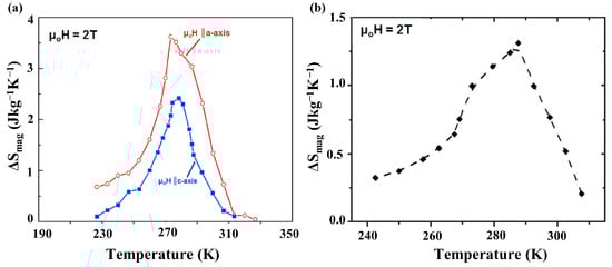 (a) Magnetic entropy change curves as a function of temperature measured along the a- and c-axis of Fe2AlB2 and (b) rotating magnetic entropy curves of the Fe2AlB2 crystallites at μ0H = 2 T. Figure taken from Ref. [17].
