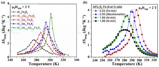 (a) Magnetic entropy change curves as a function of temperature for samples containing Fe-rich, stoichiometric, and Al-rich Al(1−y)Fe(2+y)B2 (y = −0.01–0.01). Figure taken from [7]; (b) magnetic entropy change curves of single phase samples of nominal composition, Al1.2−x(Ga, Ge)xFe2B2 (x < 0.1) at an applied magnetic field of μ0Happ = 2 T. Figure taken from [4].
