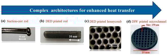 Advancements in metal AM technologies address the challenges of fabricating complex heat exchange structures with high surface-to-volume ratios and intricate geometries for magnetocaloric energy conversion. (a) Simple cylindrical rod of dia~3 mm obtained via suction casting [11]; (b) 3D-printed cylinder of dia~3 mm fabricated using DED [11]; (c) 3D-printed porous structure with thin-walled honeycombed channels with spatial resolution of ~3mm fabricated using DED [11]; (d) 3D-printed porous structure with thin-walled honeycombed channels with spatial resolution of ~150 μm fabricated using DIW technique [52].