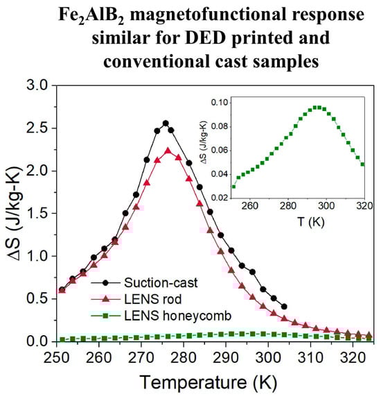 Magnetic entropy change curves as a function of temperature of the suction-cast and DED-processed cylindrical rods of nominal composition Fe2AlB2. No magnetocaloric response was observed in the 3D-printed channeled structure due to phase inhomogeneities. Figure taken from [11].