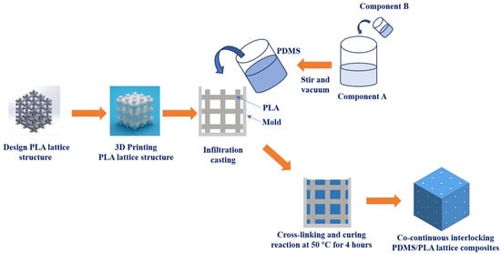 The fabrication process of co-continuous interlocking PDMS/PLA lattice composites.