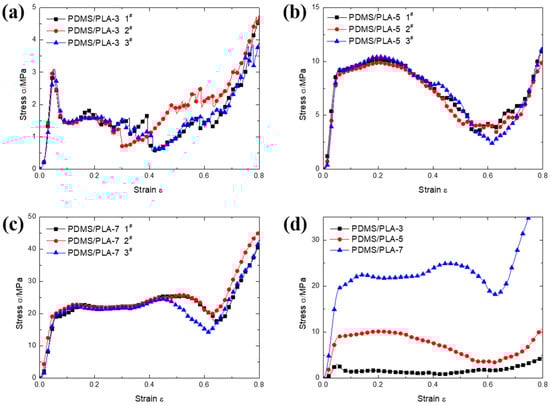 The compressive stress–strain curves of co-continuous interlocking PDMS/PLA lattice composites (a) PDMS/PLA-3, (b) PDMS/PLA-5, (c) PDMS/PLA-7 and (d) the comparison among them.