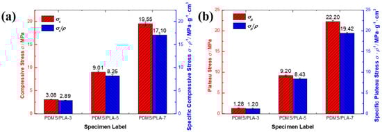 The compressive property indexes of the co-continuous interlocking PDMS/PLA lattice composites are shown in Figure 6. The compressive property indexes include the compressive strength σc, the specific compressive strength σc/ρ, the plateau stress σp and the specific plateau stress σp/ρ. The compressive strength is usually taken as the first stress peak of the compressive stress–strain curve. If there no local maximum occurs, the compressive strength is determined at the 1% strain offset. The plateau stress is usually calculated by averaging the stress from strain 0.2 to strain 0.4. For specimen PDMS/PLA-3, the compressive strength was 3.08 MPa and the plateau stress was 1.28 MPa. It was found that the plateau stress was 41.56% of the compressive strength. The lowest plateau stress is not conducive to bearing loads and absorbing energy. The PLA lattice with 3 mm struts as the skeleton of the co-continuous interlocking structure showed poor load-carrying capacity. Although there is more PDMS as filler, the strut diameter of specimen PDMS/PLA-3 is too small. Therefore, the global mechanical properties are inferior. The PDMS/PLA-5 specimen showed higher compressive strength (9.01 MPa) and plateau stress (9.20 MPa). With the increase in strut diameter (5 mm), the compressive strength and the plateau stress increased around 1.93 times and 6.19 times compared with those of the PDMS/PLA-3 specimen, respectively. It was found that the compressive strength and the plateau stress are almost identical. This result is beneficial to bearing load and absorbing energy. The PDMS/PLA-7 specimen exhibited the highest compressive strength (19.55 MPa) and plateau stress (22.20 MPa) in this study. Though the PDMS/PLA-7 specimen has a similar structure to PDMS/PLA-3 and PDMS/PLA-5, it has the largest strut diameter (7 mm) for the PLA lattice. The compressive strength and the plateau stress were 2.17 times and 2.41 times of the PDMS/PLA-5 specimen, respectively. Meanwhile, the plateau stress was close to the compressive strength of specimen PDMS/PLA-5. Considering the wider plateau region, the PDMS/PLA-7 specimen showed a superior capacity of bearing load and absorbing energy.