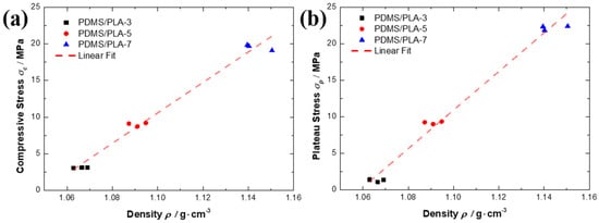 The increase in strut diameter affects the density of the co-continuous interlocking PDMS/PLA. Considering the effect of the density, the specific compressive strength and the specific plateau stress of the co-continuous interlocking PDMS/PLA were calculated. Due to all co-continuous interlocking PDMS/PLA specimens’ density being higher than 1.0 g/cm3, the specific compressive strength and specific plateau stress slightly decreased compare with the compressive strength and plateau stress. With the strut diameter increasing, the specific compressive strength and specific plateau stress increased. Similarly, the PDMS/PLA-7 specimen still exhibited the highest specific compressive strength and the specific plateau stress in this study. This proves that the strut diameter of the PLA lattice as a skeleton is an important factor that can adjust the mechanical properties of the co-continuous interlocking PDMS/PLA. Figure 7 shows the compressive strength/plateau stress and corresponding density ρ of the co-continuous interlocking PDMS/PLA lattice composites. It was found that the compressive strength and the density are linearly correlated. Similarly, the plateau stress and the density are linearly correlated. The slope (208.16) of the compressive strength and density is slightly lower than that of the plateau stress and density (264.08), proving that the variation in density has a greater effect on the plateau stress of the co-continuous interlocking PDMS/PLA lattice composites.