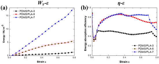 where σ, ε and σmax are the stress, the strain and the maximum compressive stress in the strain range [0, ε], respectively. The η-ε curves of the co-continuous interlocking PDMS/PLA lattice composites are plotted in Figure 8b. These curves are calculated by the average stress–strain curves for each condition.