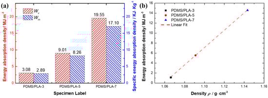 The energy absorption density of co-continuous interlocking PDMS/PLA lattice composites at the 0.6 strain is depicted in Figure 9a. At the same time, the effect of the specimen density on energy absorption is considered. Therefore, the energy absorption density WV at the 0.6 strain and the specific energy absorption density Wm at the 0.6 strain of co-continuous interlocking PDMS/PLA lattice composites are comparatively analyzed. The specific energy absorption density Wm is defined as WV/ρ. However, considering the effect of density, the PDMS/PLA-7 specimen still exhibits the highest specific energy absorption density. Figure 9b shows the energy absorption density and corresponding density ρ of co-continuous interlocking PDMS/PLA lattice composites. It is found that the energy absorption density and the density are still linearly correlated. The energy absorption density increases with the specimen density increasing. This result verifies that the variation of density can affect the energy absorption density of co-continuous interlocking PDMS/PLA lattice composites.
