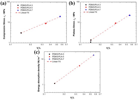 As the co-continuous interlocking structure, the two phases, PLA and PDMS, play different roles. The PDMS fills the pores of the PLA lattice and wraps the PLA struts, playing a supporting role. Therefore, the PDMS as a filler prevents the negative effects resulting from the sudden rupture of PLA struts. Based on the aforementioned analysis, it is found that the PLA lattice acting as skeleton plays an important role in bearing the compressive load and energy absorption. In this study, changing the strut diameter actually alters the volume fraction of the PLA. With the strut diameter increasing, the volume of the PLA lattice increases. The relationships between the compressive strength, plateau stress, energy absorption density and the PLA volume fraction Vf of the co-continuous interlocking PDMS/PLA lattice composites are plotted in the Figure 10. The compressive strength σc and PLA volume fraction Vf are linear in logarithmic coordinates (Figure 10a). With the PLA volume fraction increasing, the compressive strength increases. The slope and intercept are 1.349 and 1.614, respectively.