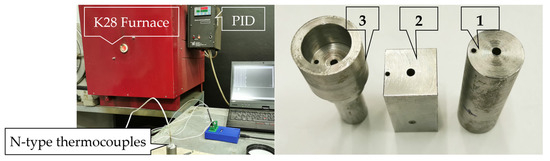 - Thermocouple made by TC Direct (Uxbridge, UK), N type, 1.5 mm and 3 mm diameter, Class 2: at a temperature of 1060 °C, the permissible deviation is 8 °C.