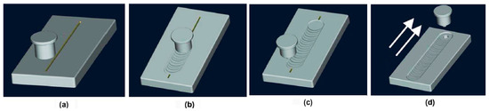 A schematic of the preparation process of GNPs/Al with FSP. (a) Original position, (b) welding process, (c) returning to the original position and (d) a repeated pass.