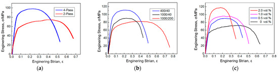 The engineering stress/engineering strain curves under different preparation process parameters. (a) Stirring passes, (b) the ratio of the stirring/welding velocity, and (c) the graphene content.