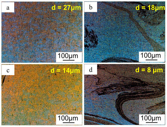 The microstructure of GNPs/Al under different graphene contents is shown in Figure 8, where the stirring pass was four, and the ratio of stirring/welding velocity was 1000/40. Corresponding grain sizes with 0, 0.5 vol.%, 1.0 vol.%, and 2.0 vol.% were 27 μm, 18 μm, 14 μm, and 8 μm. It was shown that the grain size decreased with the increase in graphene content. Moreover, grain size at the graphene enrichment zone was smaller than that at the graphene-poor zone. Graphene particles can act as heterogeneous cores during the recrystallization process, promoting non-uniform nucleation and thus refining the grain size. Meanwhile, graphene particles are pinned at aluminum grain boundaries, hindering grain boundary movement and thus inhibiting grain growth. According to the Hall–Petch relation, fine grain can improve material strength.