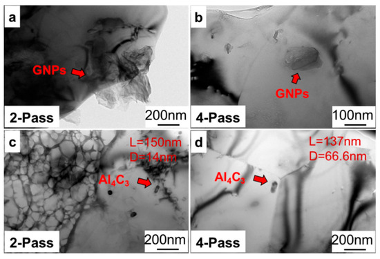 Firstly, the interface characteristics of GNPs/Al under different passes were revealed with TEM. As shown in Figure 9a,b, with the increase in stirring pass, the dispersion of graphene in the matrix became more uniform, and the agglomeration phenomenon decreased. As shown in Figure 9c,d, it was found that there was an Al4C3 phase in the stirring zones, which showed that an interface reaction occurred. Moreover, when the stirring passes increased from 2 to 4, the diameter of the Al4C3 phase increased from 14 nm to 66.6 nm. This is mainly because more heating input under four passes promoted an interface reaction.