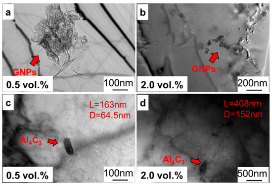 The TEM morphology of GNPs/Al with graphene content; (a,c) 0.5 vol.% and (b,d) 2.0 vol.%.