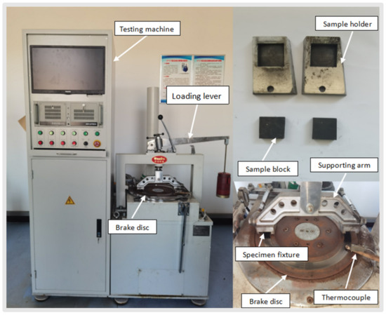 The tribological performance of specimens was evaluated by a constant-speed tester (JF150F-II, Wangda, Changchun, China, shown in Figure 3) according to GB/T 5763-2008 [35]. Specific test methods are as follows: first of all, the brake friction material was mechanically cut into 25 mm × 25 mm × 6 mm size and this specimen was fixed on the friction disk. Then, the specimen was heated using a heating tube before grinding. It must be taken into account that the temperature should always be lower than 100 °C, while the contact surface of the specimen with the friction disc should be more than 95%. At the end of the break-in phase, the specimen was cooled to room temperature, and its thickness was measured in 5 places (4 corner points and 1 center point). After this, the temperature of the friction disc was increased to 350 °C After reaching the maximum temperature, the friction disc was cooled so that its temperature dropped at intervals of 50 °C, and the friction value was determined during 1500 revolutions of the disc. Friction measurement was repeated at a temperature of 100 °C for 500 revolutions of the friction disk. Each brake friction material was tested five times, and the average friction value was calculated [36,37].