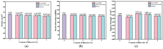 (a) The density of added single-fiber specimens; (b) the hardness of added single-fiber specimens; (c) the impact resistance of added single-fiber specimens.