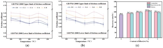 The recovery rate test results are shown in Figure 6c. It can be seen that the recovery rates for reinforced specimens with equal content of plant fibers are almost the same. The specimens containing 6 wt.% plant fibers had the greatest recovery (101.6% and 103.8%), while the unreinforced specimen had the least recovery (89.8%). This indicates that the addition of plant fibers can enhance the recovery performance of the brake friction material, which is improved compared with that of the brake friction material without added fiber. With the increase in the fiber content, its recovery rate increases, but beyond a certain level, it will have a certain negative impact on its friction performance [51].